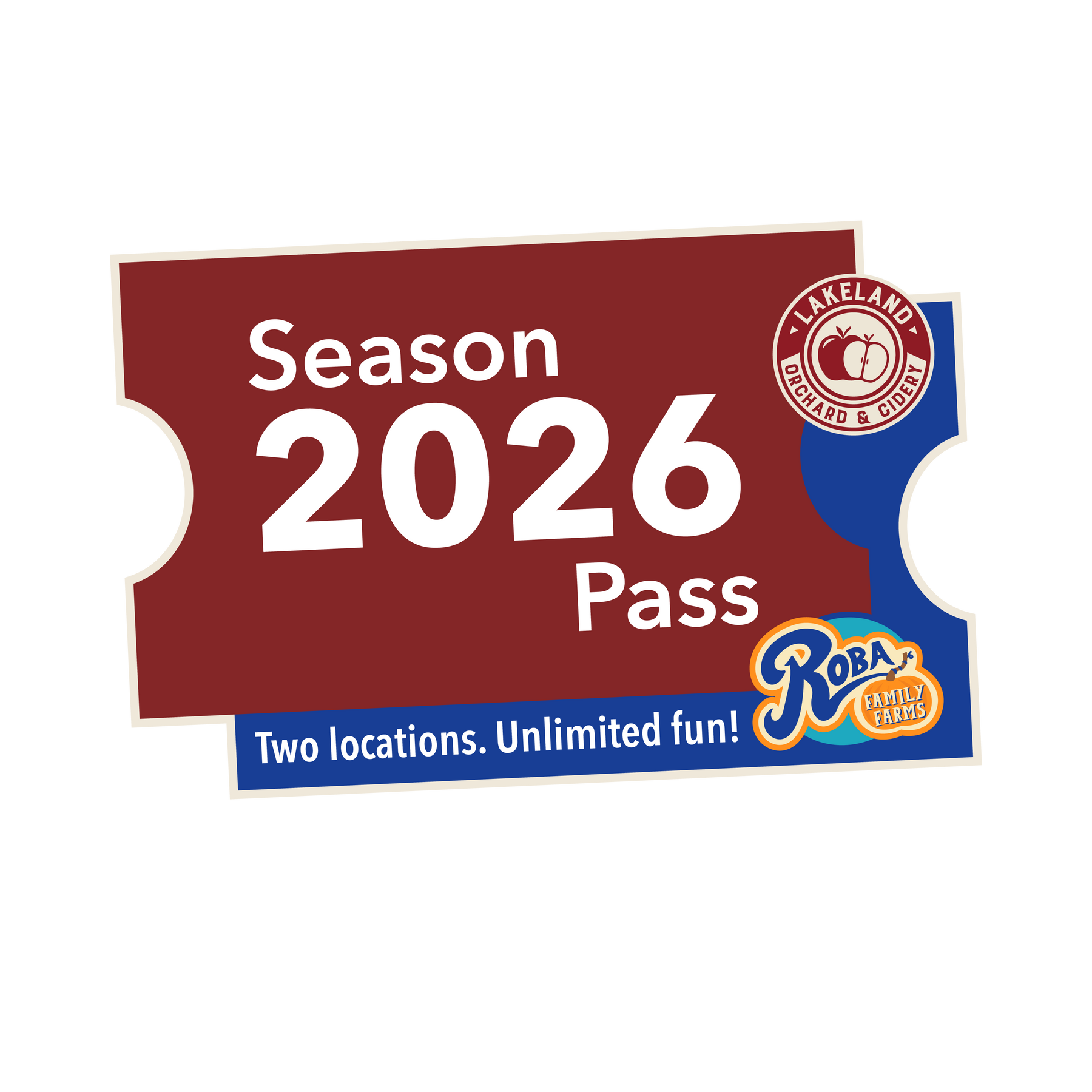 - All season passes purchased are non-refundable and good for the 2026 season only for Roba Family Farms and Lakeland Orchard & Cidery.